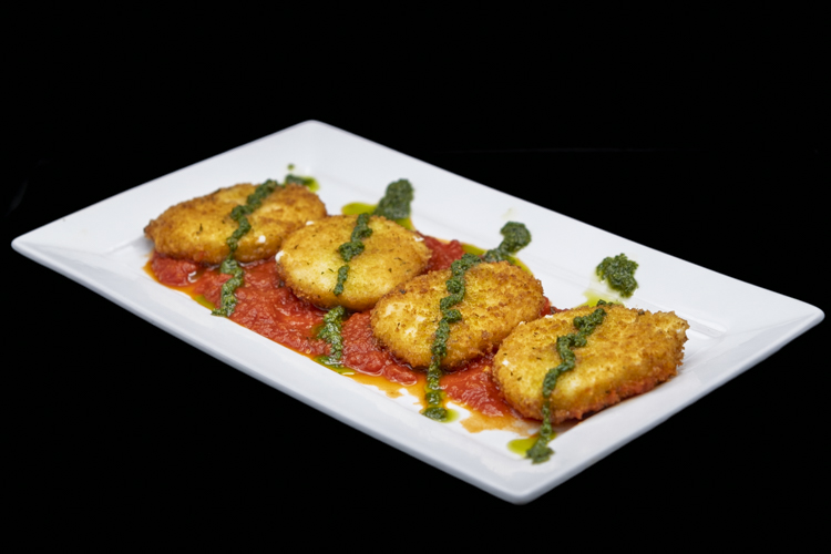 Breaded Mozzarella with tomato and pesto sauce.