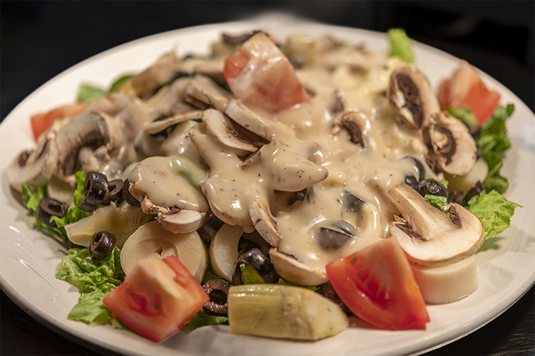 Green leaf lettuce, Hearts of palm, Tomatoes, Artichoke hearts, Mushrooms, and Black Olives.