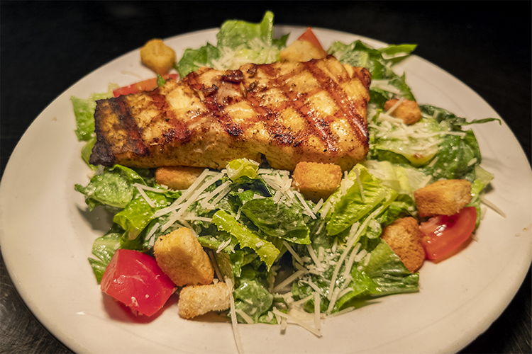 Our Caesar salad topped with grilled salmon.